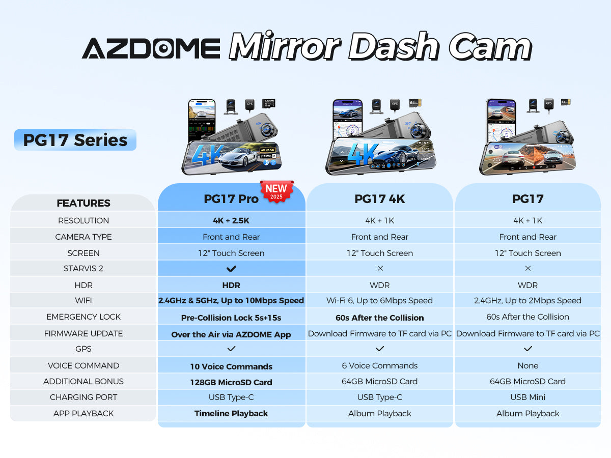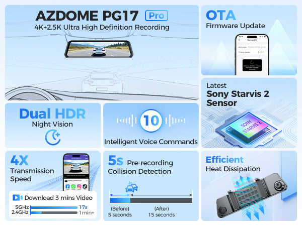 AZDOME PG17 Pro 4K+2.5K Mirror Dash Cam with STARVIS 2 & 5G WiFi Rear View Mirror Camera, OTA Upgraded, Parking Assist, Voice Control, 64GB Card