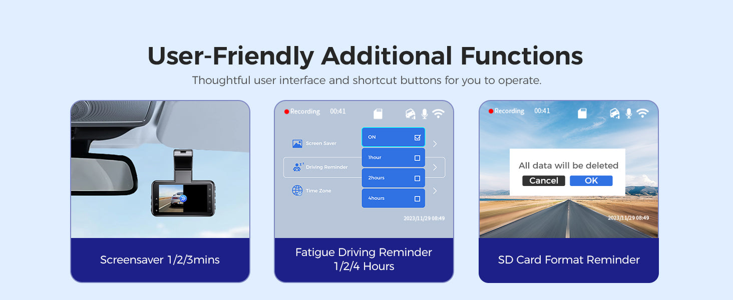 - 24 Hours Parking Monitor: Front dash cam automatically records important events when detects impact. 24H parking mode allows user to have peace of mind after getting out of the vehicle. Please purchase an additional hardwire kit for parking mode (search ASIN: B096G6FKZP).