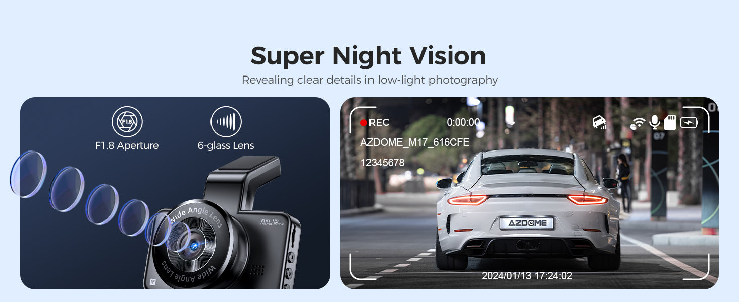 - Super Night Vision: With F1.8 large aperture and 6-glass wide angle lens, M17 dash cam uses professional-level Full HD GC2053 CMOS image sensor with the Mstar 8336 chip to capture finest details even at night.