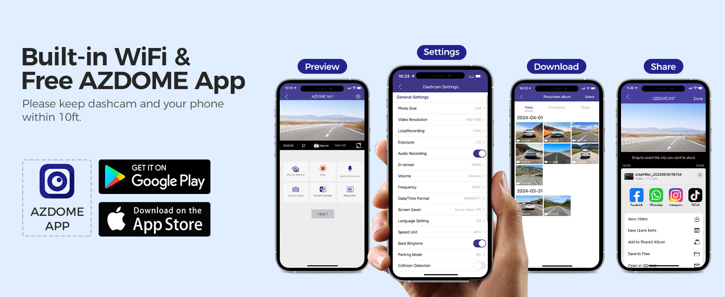 - Built-in WiFi: User could connect car WiFi driving recorder to 'AZDOME App' on iOS or Android devices. WiFi dash camera could support video playback, download and management. User could share travel landscapes and moment with friends and family.