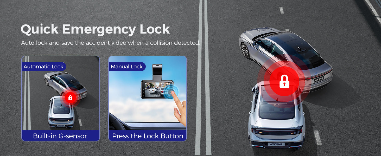 - G Sensor Loop Recording: AZDOME M17 dashcam will lock emergency video in the event of a collision. Car security camera automatically overwrites old unlocked video when the memory card is full. Both G-sensor and loop recording function prevent important files from being overwritten.
