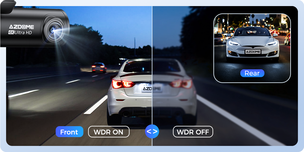 - At night, rear cams blur from tail light glare, but WDR fixes this to capture license plates of cars hitting you while parked.