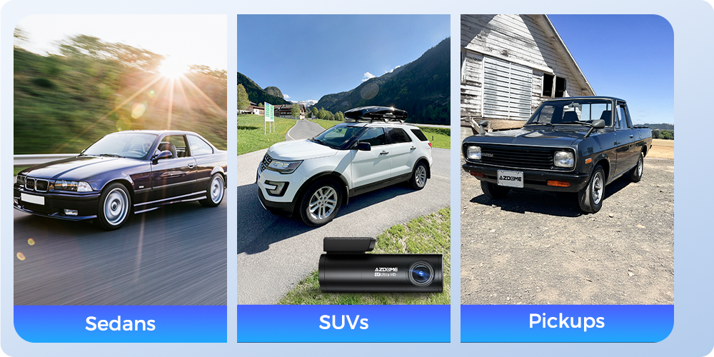 For Sedans (Like BMW 3 Series), SUVs (Like Jeep Wrangler), Pickups (Like Ford F - 150) This Dash Cam M300S, Perfect Fit.